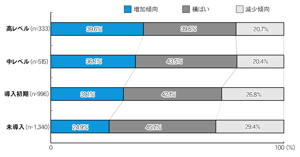 アンケートからは、「財務・会計」「在庫管理」「給与管理・勤怠管理」「受発注」「顧客管理」などの間接業務のIT導入が進んでいる企業ほど、売上が増加傾向にあることがわかりました。